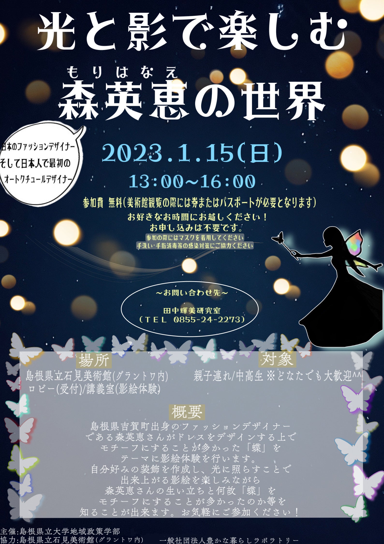 島根県吉賀町出身のファッションデザイナーである森英恵さんがドレスをデザインするうえでモチーフにすることが多かった「蝶」をテーマに影絵体験を行います。幻想的な空間を楽しみながら森英恵さんの生い立ちとなぜ「蝶」をモチーフにすることが多かったのかなどを知ることができます。