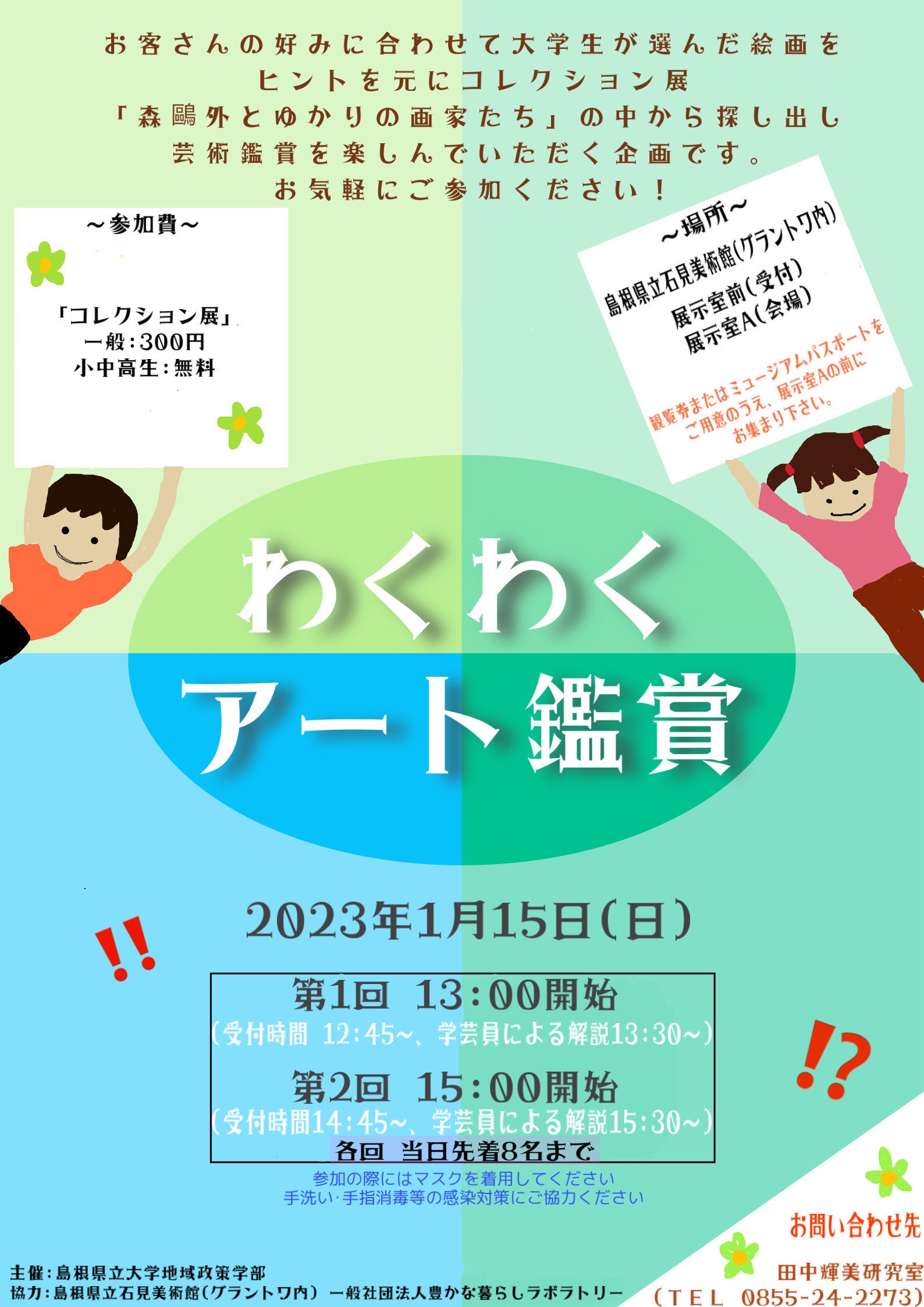 今回、島根県立大学生が島根県立石見美術館(グラントワ内)で開催される特別展とコレクション展にちなんだ2つの参加型企画を1/15(日)に開催します!それぞれの企画で特別展やコレクション展に親しみながら、これまでとは違った美術館の楽しみ方を体験してみませんか?
