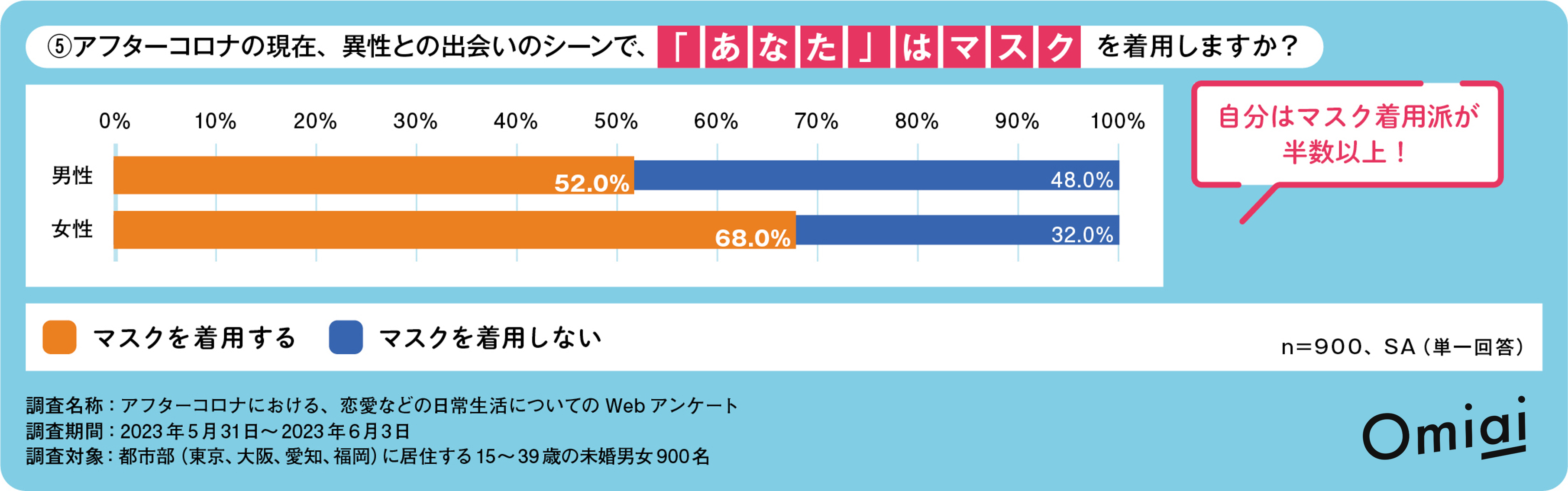 「アフターコロナの現在、異性との出会いのシーンで、自分はマスクを着用するか」(グラフ⑤)をアンケート調査したところ、「マスクを着用する」が男女ともに50%以上。特に女性は68.0%と、マスク着用派が多いことがわかりました。アフターコロナもマスク着用意識は依然として高いようです。