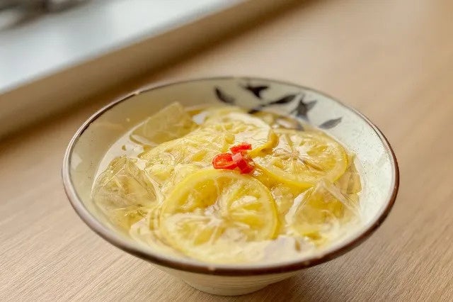 うどんやドリンクでおなじみ、香川県仁尾町で生産されたさぬきレモンに加えて、めったに手に入らない生の香川本鷹(トウガラシ)をトッピング。