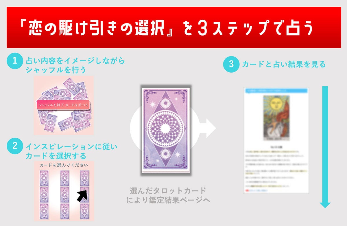 利用者は、自身の「現在恋のお相手との駆け引きにおいて、押すべきか引くべきか(アタックをかけるか控え目にまわるべきか)」をタロット占い機能により占うことができます。このタロット占いはワンオラクル方式(1枚のカードを選ぶ占い方法)で行い、シャッフル後に展開された9枚のなかからインスピレーションを得た1枚を選ぶことで占うことができます。