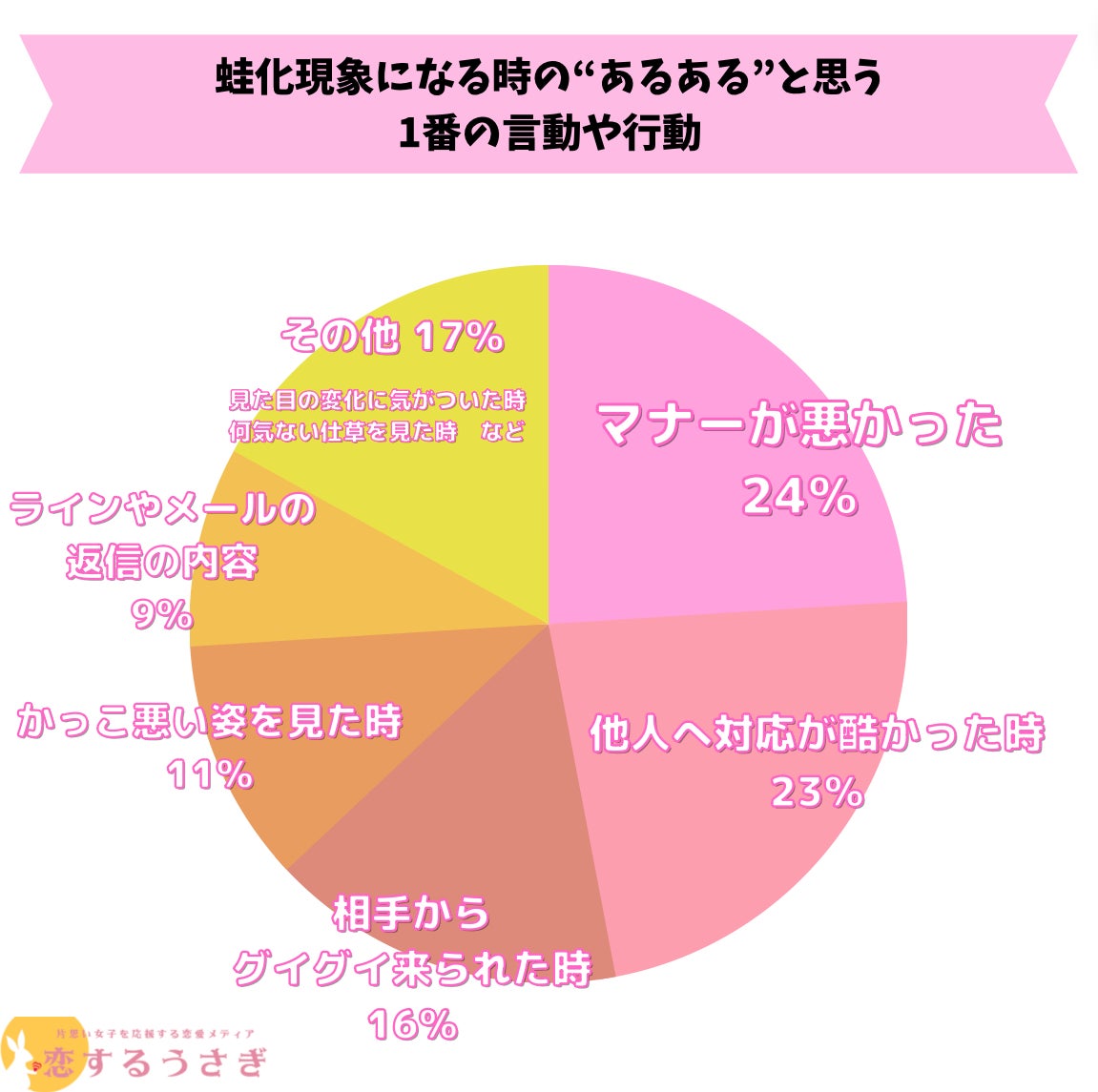 恋するうさぎ編集部が行った「蛙化現象のあるある言動・行動」のアンケートによると、1位は『マナーが悪かった』24%、 2位は『他人へ対応が酷かった』23%、3位は相手からグイグイ来られた時16%という結果になりました。