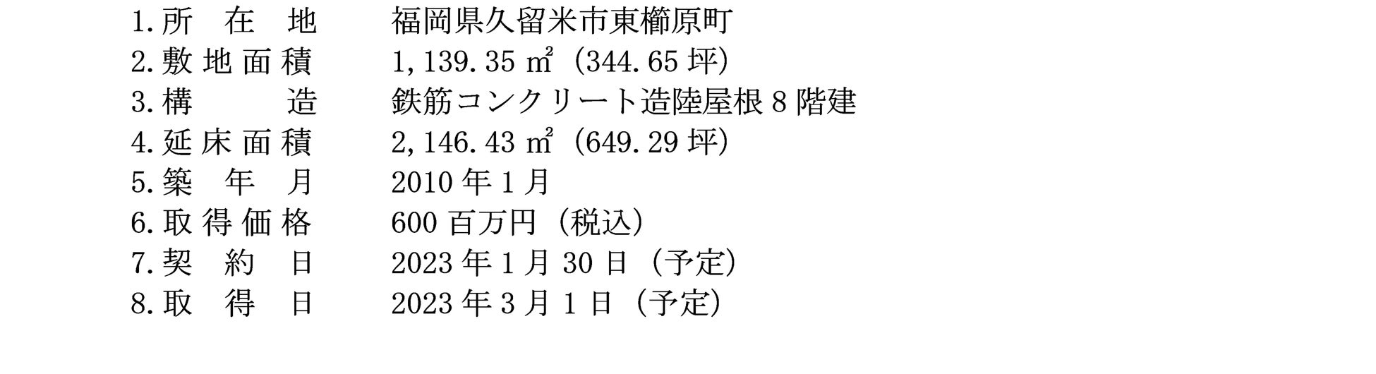 本物件取得により、年間26百万円程度、親会社株主に帰属する当期純利益が増加する見通しであり、2022年5月13日発表の2023年3月期の業績予想に織り込んでおります。