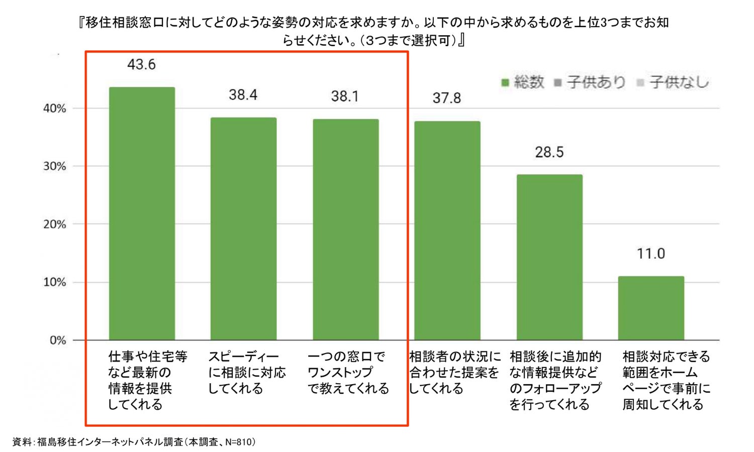 移住検討のための現地訪問で欲しいサポート についての質問では「現地視察サポート」が第1位。現地でなければ感じられない生の情報を得る方法が求められていることが分かりました。また、実際に移住した後のサポートとして求めるものは、「気軽に相談に乗ってくれる地域サポーター(48.3%)」が最も関心が高く、「地域住民との接点づくり(40.2%)」が続きました。特に、子育て世帯では「地域住民との接点づくり」がその他よりも5.5ポイント高い傾向にあります。移住者の具体的な困り事に対応できる地域住民や地域特有のローカルルールについての情報提供の重要性が明らかになりました。