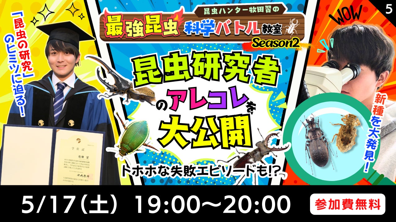 「昆虫研究家」であり、NHK「ダーウィンが来た!」などに出演経験がある昆虫ハンターの牧田習さんが、昆虫の新種発見秘話や研究の日常、「昆虫博士」への道を楽しく解説します。