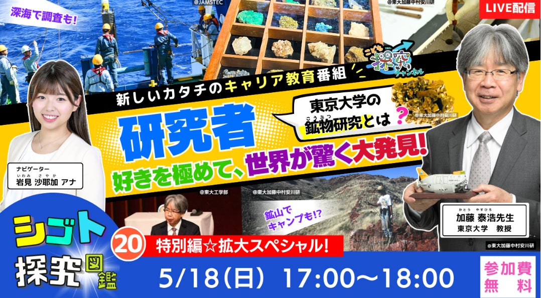 スマートフォンやコンピューター、電気自動車など、様々なハイテク機器に欠かせない素材である「レアアース」を日本の海底で大量に発見した東京大学工学部の加藤泰浩教授をゲストに迎え、世界を驚かせた新しい資源「レアアース泥」発見の裏側や研究者になるまでの道のりを語っていただきます。直接質問できる貴重な質問タイムも実施予定。