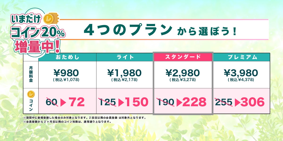 【内容】キャンペーン期間中に初めて会員登録した方に限り、通常のコイン付与枚数に加え、20%増量してコインを付与します。