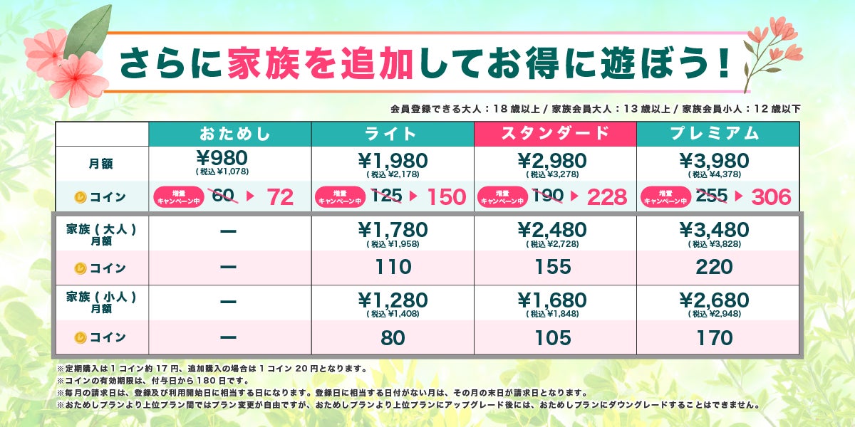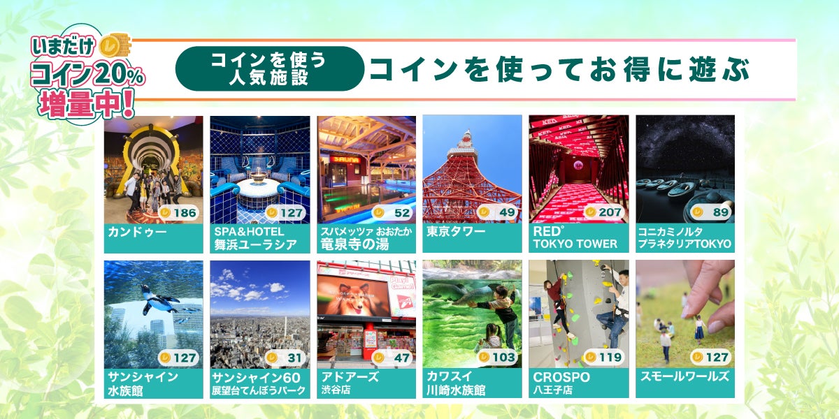 キャンペーン期間中に新規登録いただくと、すべてのプランで付与されるコインが20%増量されます。多くのレジャー施設を利用できるのはもちろん、コインを貯めないと行けない施設にも手が届きやすくなり、「レジャパス」でレジャー・エンタメをより楽しむことができます。