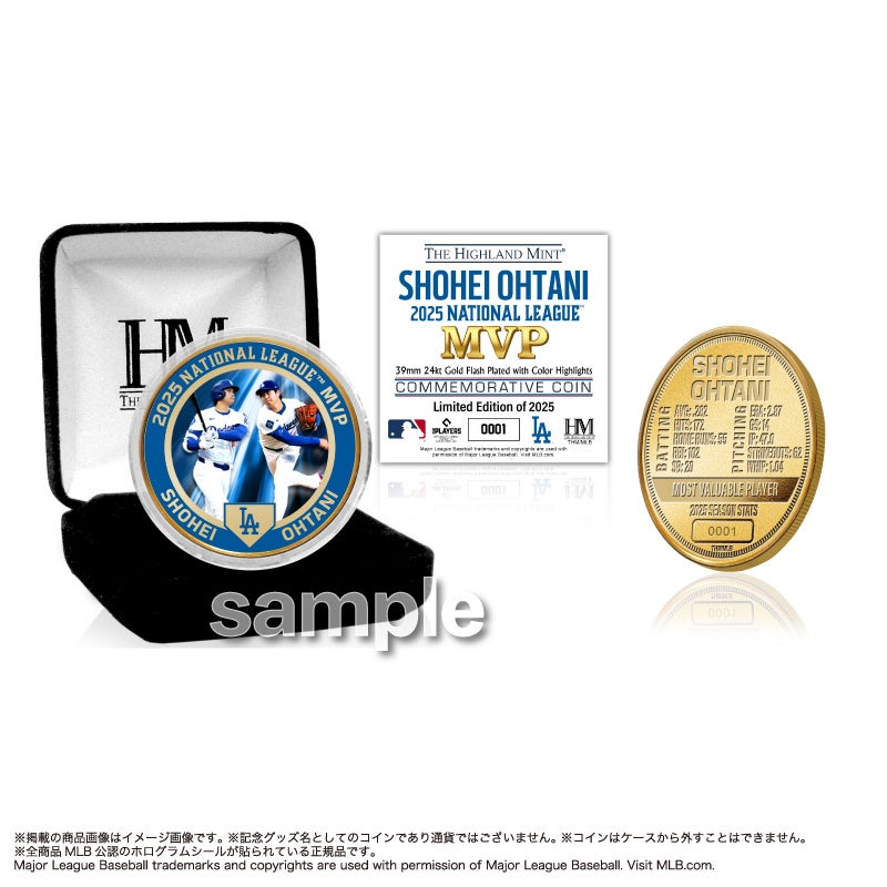 シーズン初本塁打、初勝利などの印象的なシーンをフォトで構成し、中央にはNL MVPデザインとスタッツを刻んだ24ktゴールドメッキコイン3枚をセット。