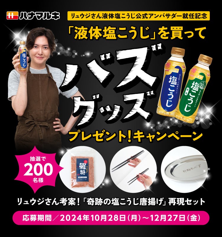 味噌・醸造製品メーカーのハナマルキ株式会社(本社:長野県伊那市、代表取締役社長:花岡周一郎、以下当社)は、主力商品「液体塩こうじ」の公式アンバサダーに起用した料理研究家・リュウジさんデザインの「液体塩こうじ」限定ボトルを、2024年10月中旬より順次出荷開始します。また、リュウジさんの公式グッズが200名様に当たるレシートキャンペーンも同時展開します。キャンペーン応募期間は、2024年10月28日(月)~12月27日(金)まで。