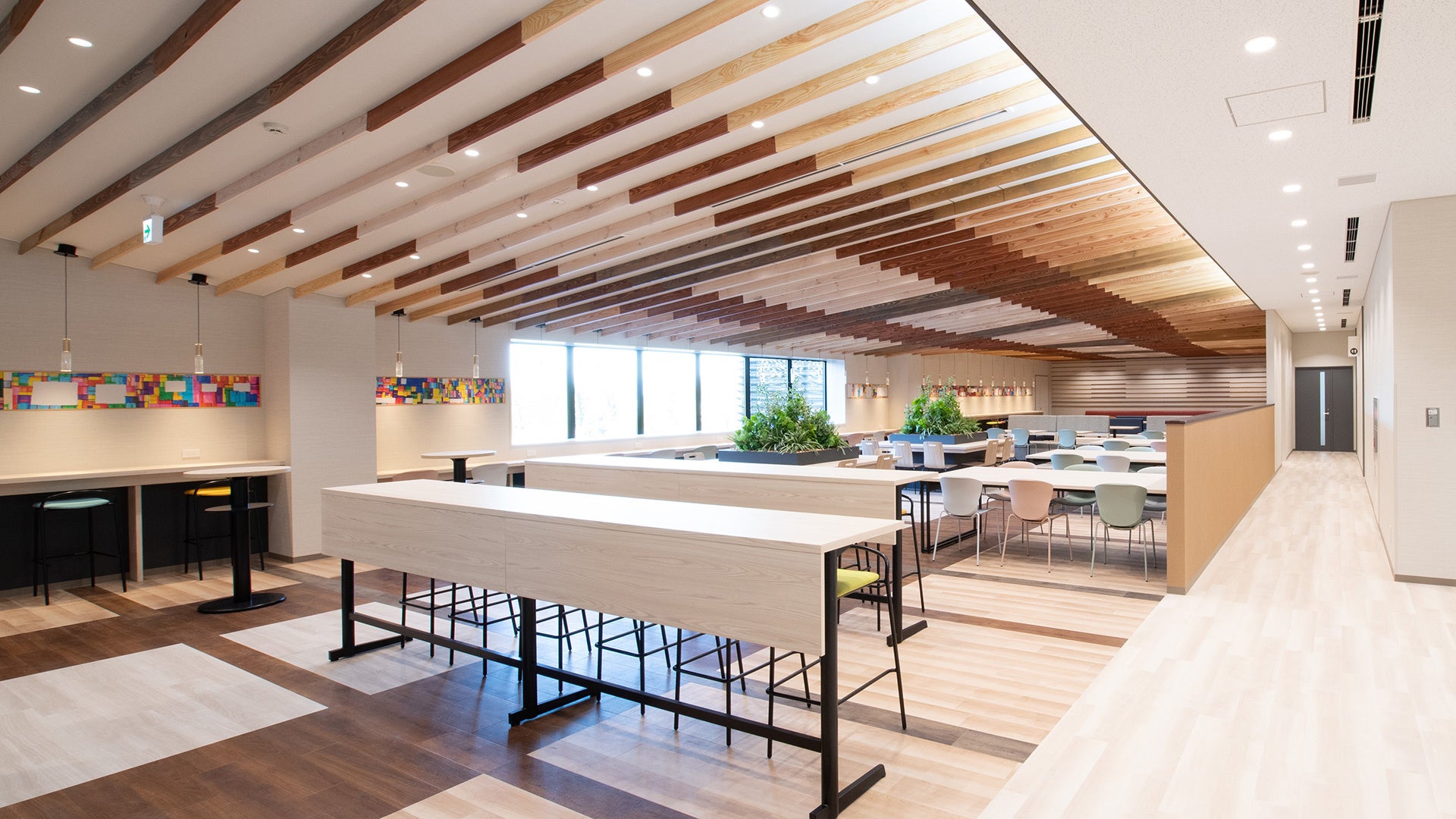施設の館内人口は500人程度を想定しています。施設内で働く方々が快適に過ごせるよう、カフェテリアには24時間営業の無人コンビニエンスストアや無料Wi-Fiを設けています。元々植わっていた敷地内の樹木は、カフェテリアの内装材やエントランス庇の軒裏天井に再利用しています。ほかにも、「異彩を、放て。」をミッションに、主に知的障害のある作家と契約を結び、アートのライセンスビジネスをはじめとした多様な事業を手掛ける福祉実験カンパニー「ヘラルボニー」(盛岡市)の理念に共鳴し、契約作家 八重樫季節良の作品を、施設空間を彩るアートとして採用しました。