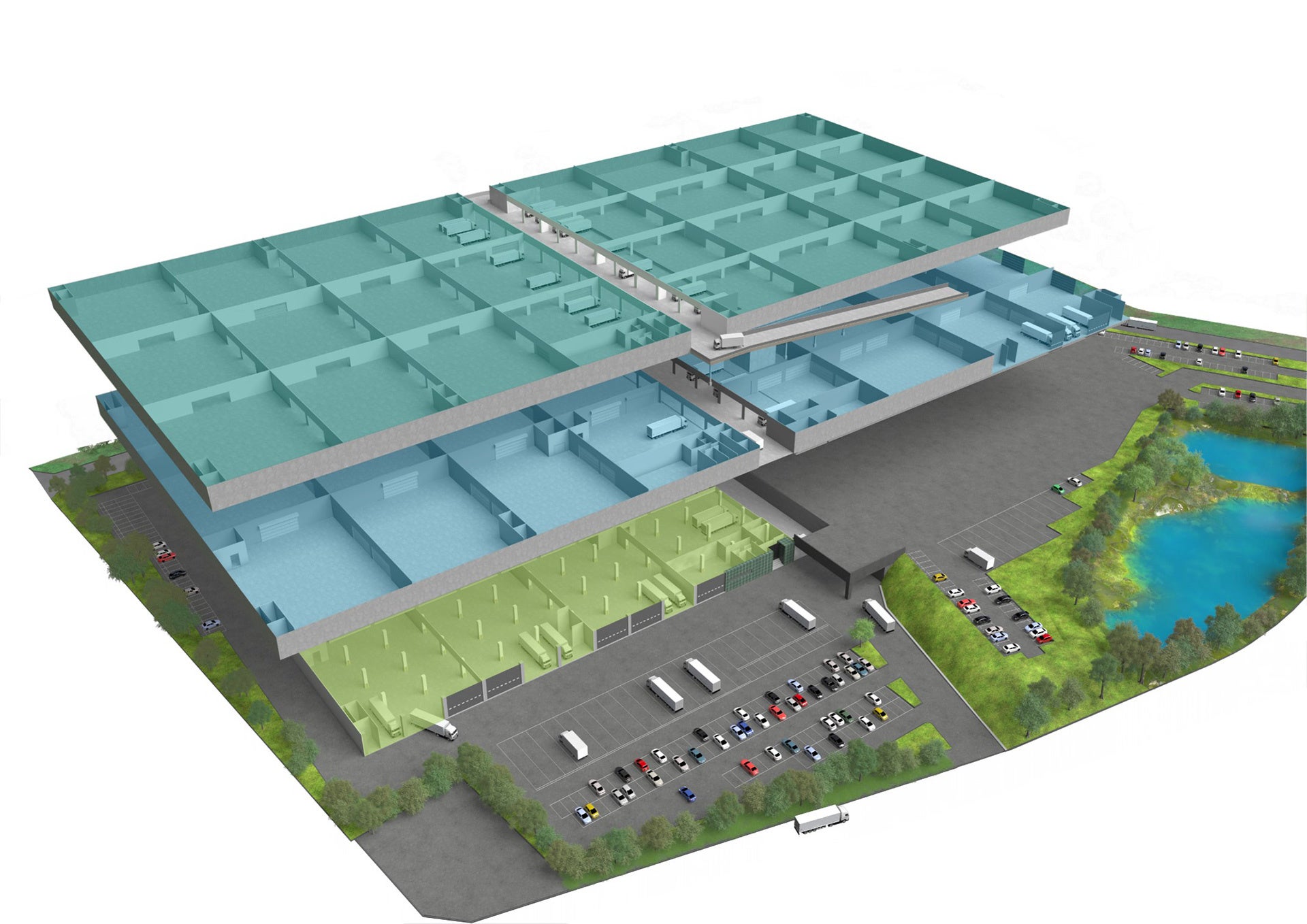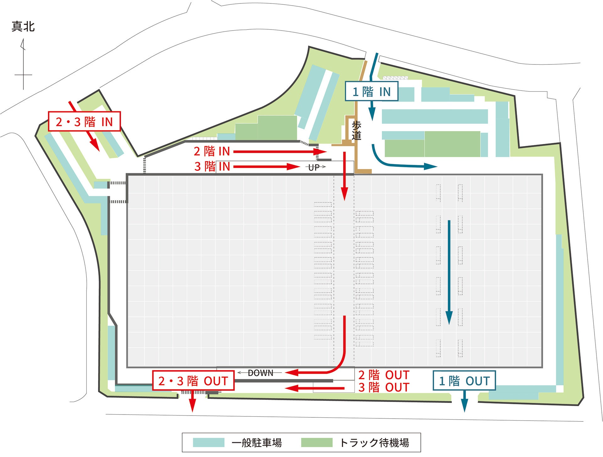 施設は、地形を利用した高低2段構造になっており、高低差を利用して、1階へも2階へも道路レベルから直接乗り入れができ、スロープを利用して3階へも直接アクセス可能です。敷地内は全て一方通行とし、各階の出入り口を中央車路で繋げる構造を取っているため、安全で機動性の高い通行と荷捌きができます。