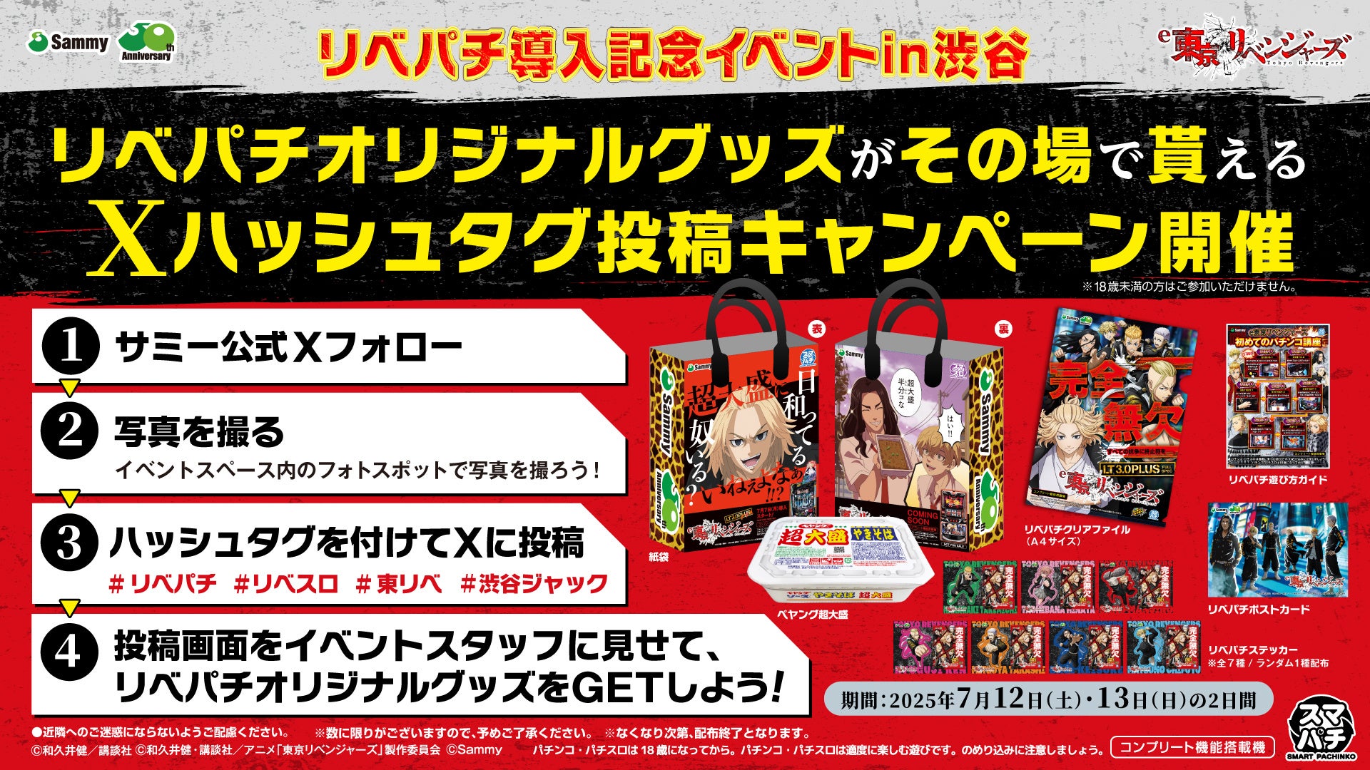 サミー株式会社(本社:東京都品川区 代表取締役 社長執行役員 COO:星野 歩)は、「e東京リベンジャーズ」(製造元/株式会社銀座)の導入を記念し、7月12日(土)、7月13日(日)の2日間限定で渋谷道玄坂広場にて『リベパチ導入記念イベント in 渋谷』を開催いたします。