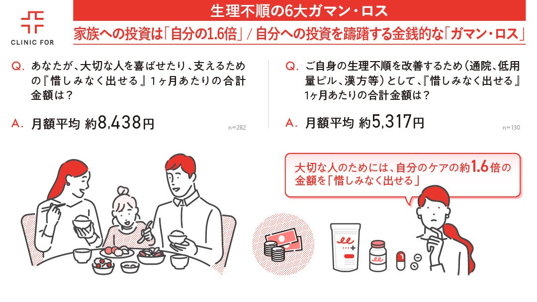 また、金銭面における意識についても顕著な差が見られました。子供や家族など「大切な人」を喜ばせたり支えたりするために、惜しみなく出せる金額は月平均8,438円であるのに対し、自分自身の生理不順を改善するために出せる金額は月平均5,317円にとどまり、約1.6倍の格差があることが判明しました。