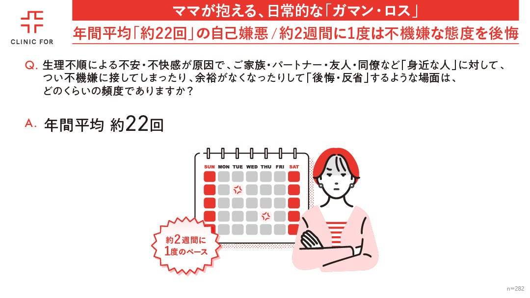 生理不順によるイライラや余裕不足が原因で、家族やパートナー、身近な人に不機嫌に接し「後悔・反省」する場面は、ママ1人あたり年間平均で約22回も発生していることが判明しました。