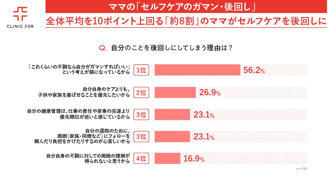 さらに、約80%ものママが自身の不調への対応を後回しにしており、その半数以上(56.2%)が「自分がガマンすればいい」という自己犠牲的な習慣の中にいます。