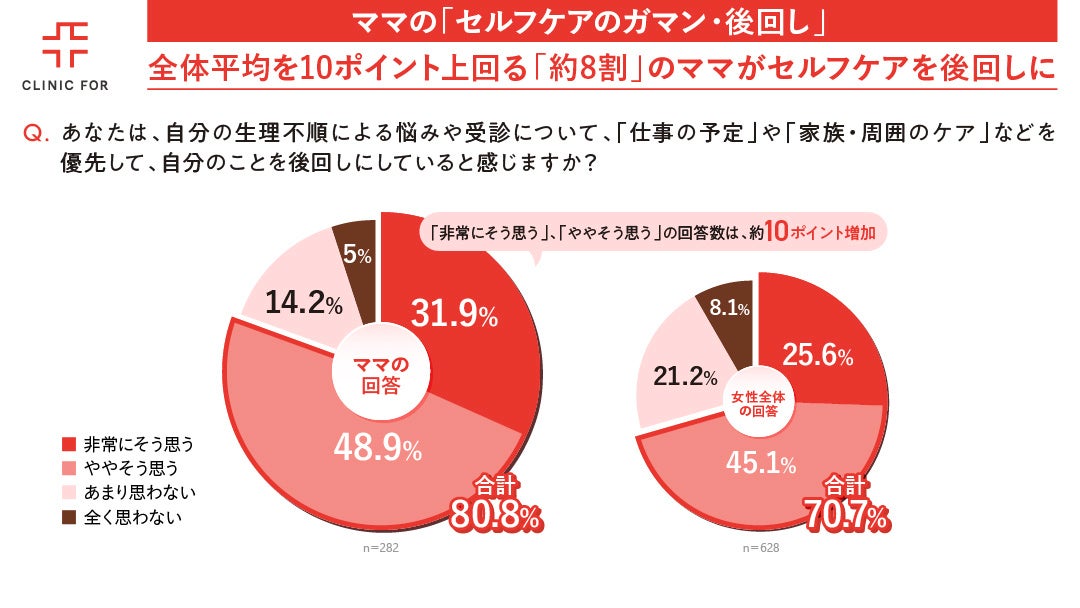 生理不順の悩みや受診について、「仕事の予定」や「家族・周囲のケア」を優先して自分のことを後回しにしているか調査したところ、ママ層では約8割(80.8%)が「後回しにしている」と回答しました。