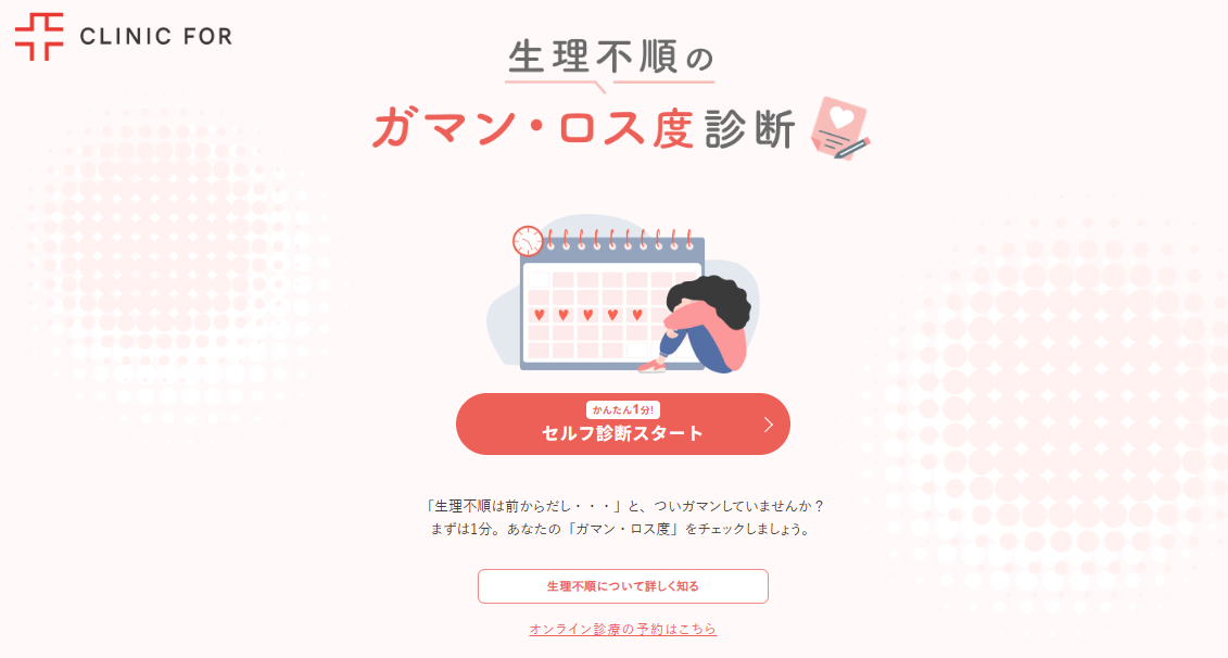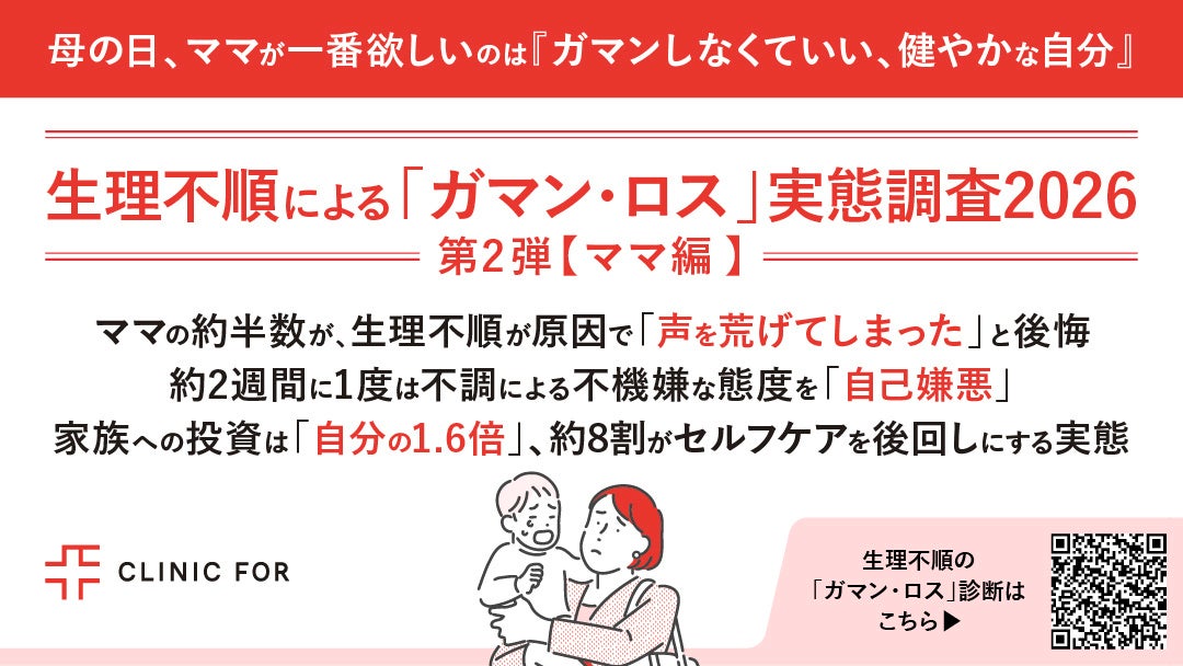 自身の不調が家庭全体の幸福度に影響している傾向に気づきにくい現状を背景に、クリニックフォアでは、自身の「ガマン・ロス」を可視化し適切なケアを検討するきっかけを提供する「生理不順のガマン・ロス度診断」の提供を開始しています。