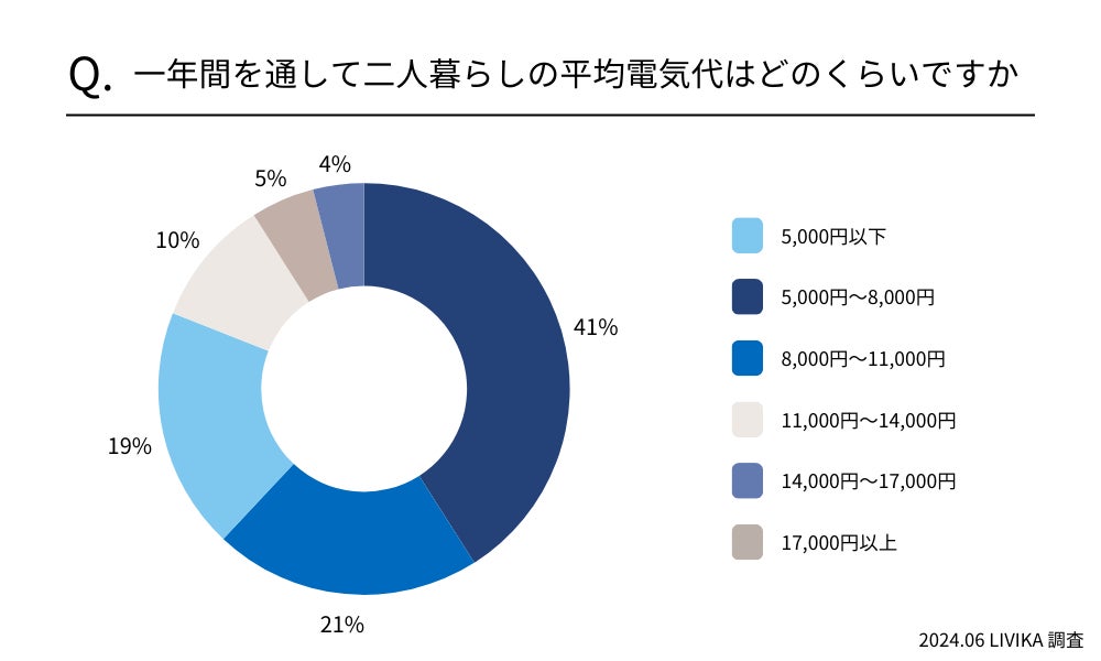関西地方に住む二人暮らしのご家庭へ、一年間を通して平均の電気代を伺ったところ、41%のご家庭が「5,000円〜8,000円」と回答しました。
