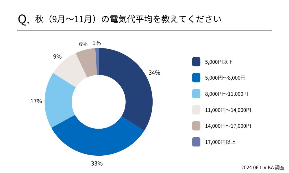 秋の平均電気代は「5,000円以下」と回答したのが34%、「 5,000円~ 8,000円」と回答したのが33%でした。