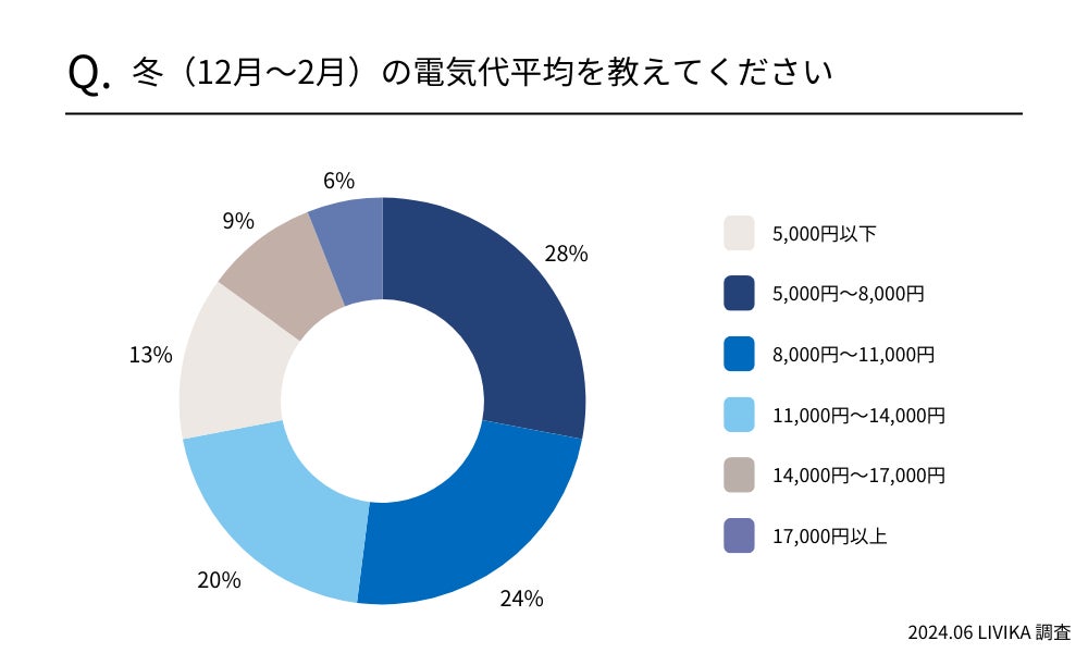 冬の平均電気代は28%のご家庭が「 5,000円~ 8,000円」と回答、24%のご家庭が「8,000円~ 11,000円」と回答しました。