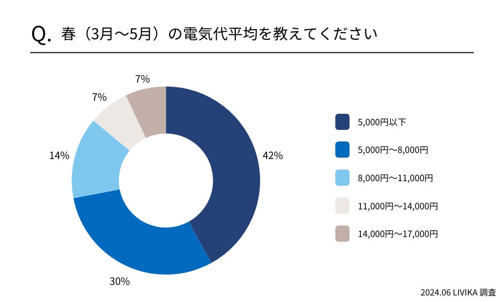 春の電気代平均を伺ったところ、42%のご家庭が「5,000円以下」と回答しました。