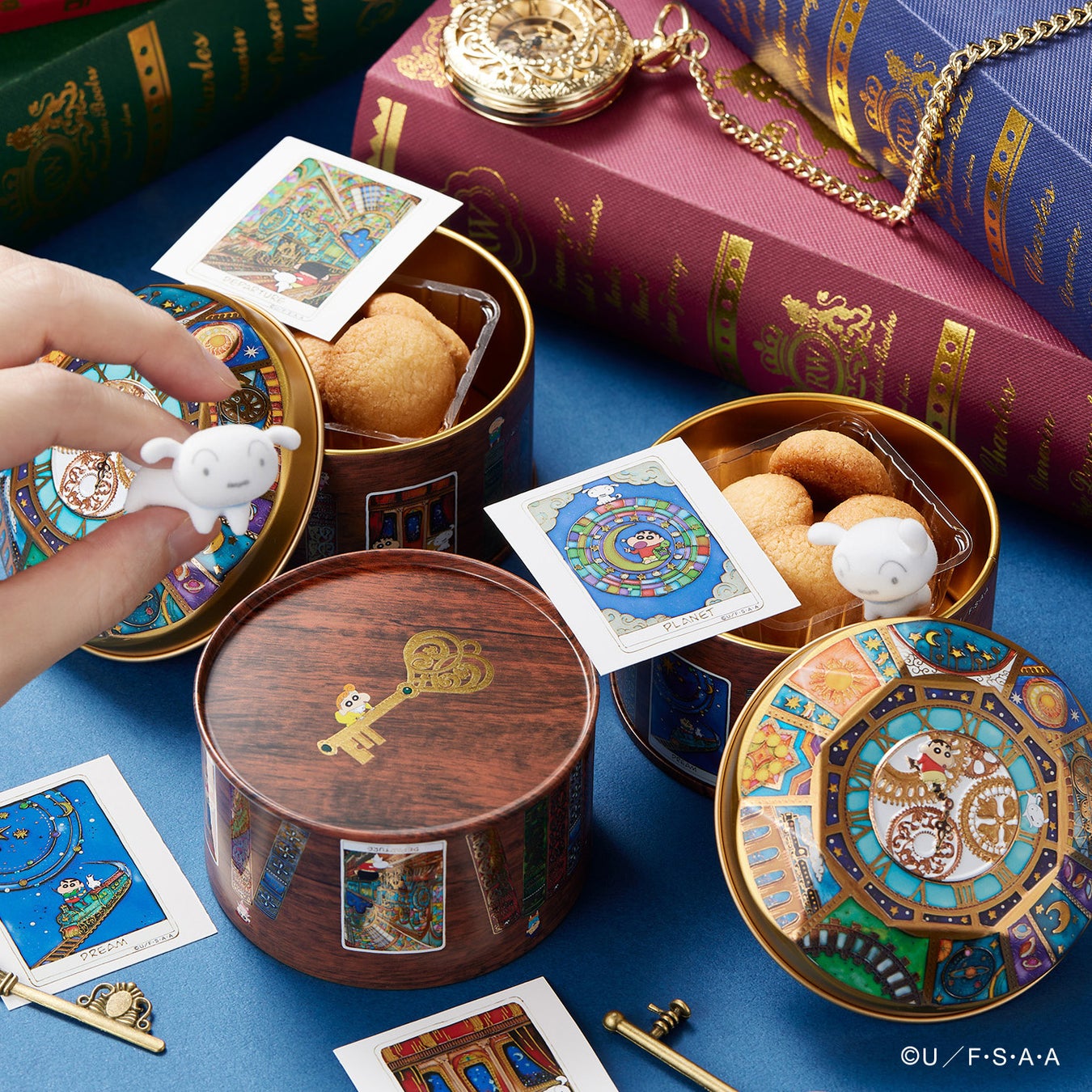 お菓子缶の蓋面には、アンティーク風な歯車時計をデザイン。中央には、ミニチュアのしんちゃんとシロが遊んでいる様子が描かれています。