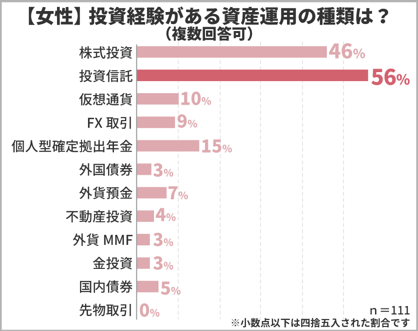 投資経験がある女性111人に投資経験がある資産運用の種類を複数回答で聞いたところ、「投資信託」が56%と「株式投資」よりも「投資信託」の割合の方が高くなっています。「株式投資」と「投資信託」の大きな違いは以下の通りです。