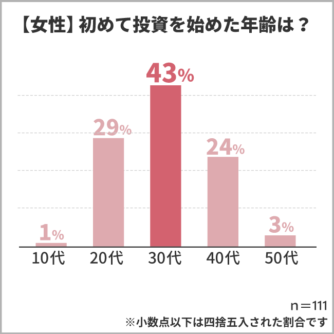 同じく女性250人中「投資経験がある」と回答した111人に「投資を始めた年齢」を聞いたところ、30代までに始めた方が73%と男性とほぼ変わらないものの、20代から始めた方の割合が男性の方が8%高い結果となっています。