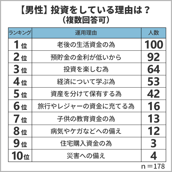 投資をしている男性178人に「投資をしている理由」を伺ったところ「老後の生活資金の為」「預貯金の金利が低い」が上位となりました。
