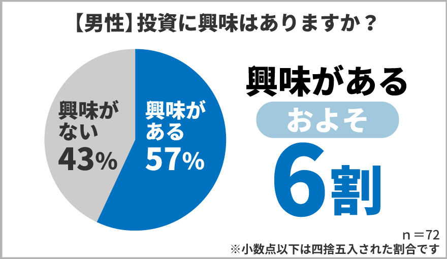 男性250人中「投資経験がない」と回答した72人に「投資に興味はありますか?」と質問したところ、57%の方が「興味がある」と回答されました。
