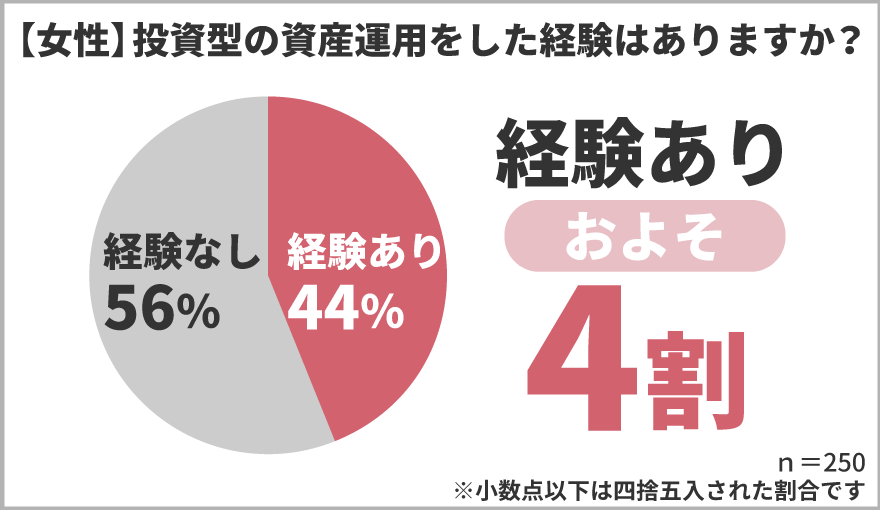 同じく女性250人にも「投資の経験があるか」伺ったところ、女性で投資経験がある方は44%と、投資経験をお持ちの方は27%も男性を下回る結果となっています。