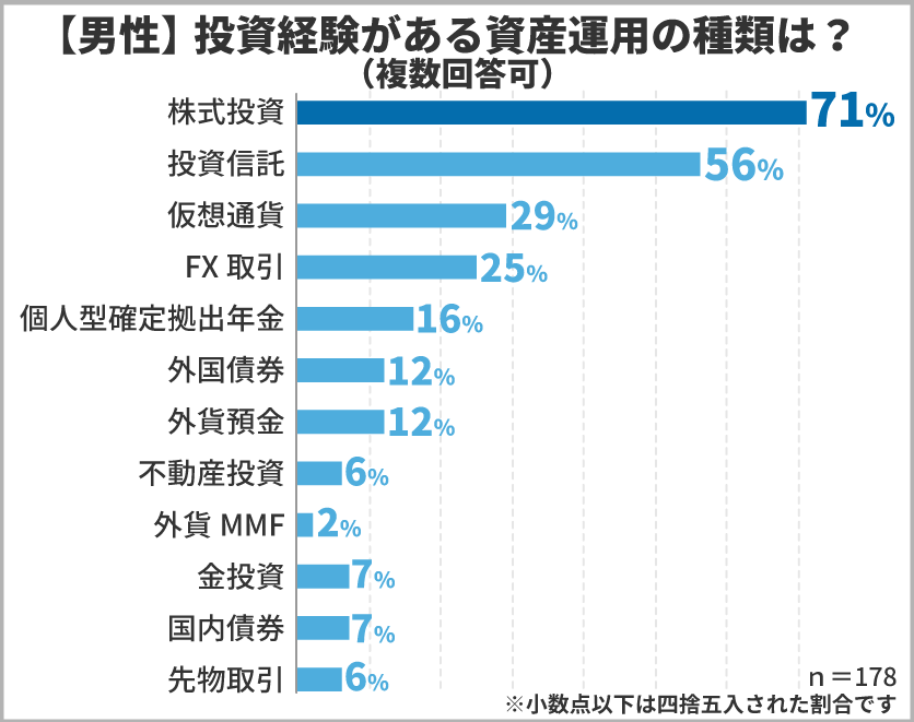 投資経験がある男性178人に投資経験がある資産運用の種類を複数回答で聞いたところ、「株式投資」「投資信託」「仮想通貨」「FX」が上位となっています。中でも「株式投資」が71%と人気を集めています。