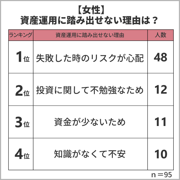 さらに投資経験がない女性の中から「投資に興味がある」と回答した95人に「投資型の資産運用に踏み出せない理由」を聞いてみたところ、「失敗した時のリスクが心配」という声が圧倒的に多く届きました。