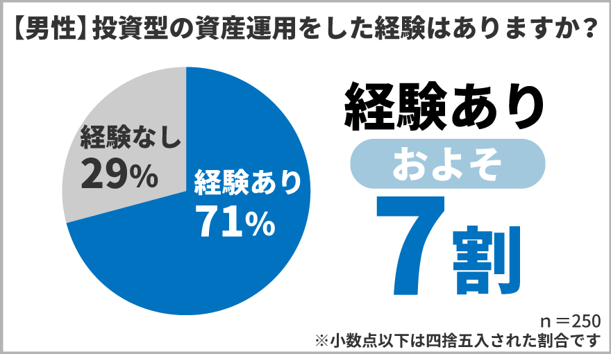 男性250人に「投資の経験があるか」聞いてみたところ、71%の方が「経験あり」と回答されました。