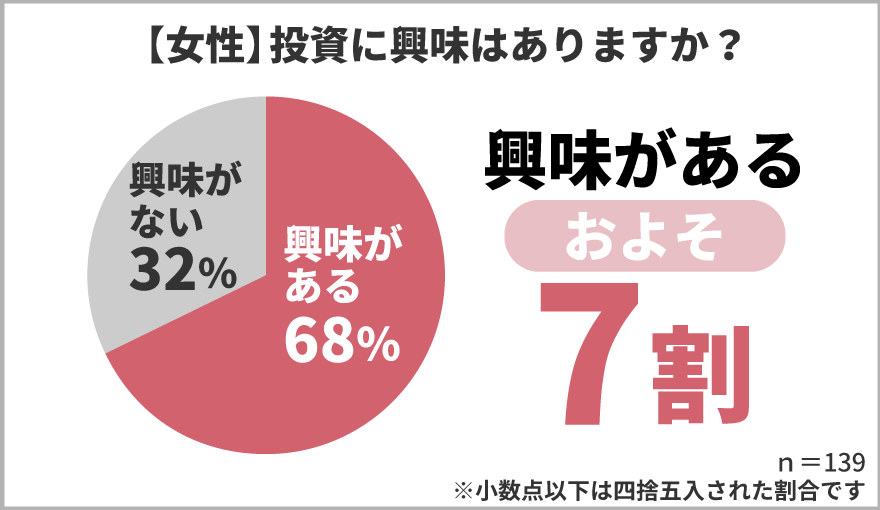 同じく女性250人中「投資経験がない」と回答した139人に「投資に興味がありますか?」と質問したところ、68%の方が「興味がある」と回答されました。