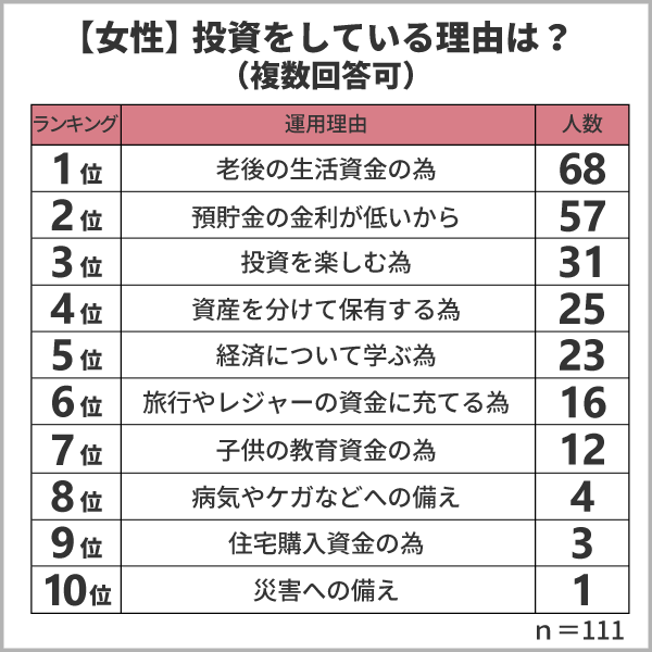 同じく投資をしている女性111人にも「投資をしている理由」を伺ったところ「老後の生活資金の為」「預貯金の金利が低い」が上位となり、上位の理由も男性とほぼ同じ結果となっています。