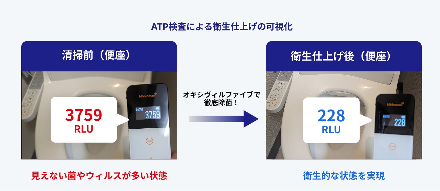 実際に、ドアノブでは清掃前3622から清掃後107、便座では清掃前3759から清掃後228まで改善した事例があり、衛生仕上げの効果を確認しています。