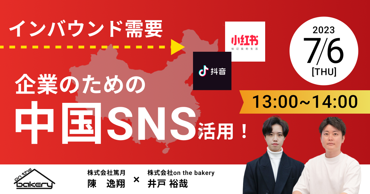 SNS・インフルエンサーマーケティングを支援する株式会社on the bakery(本社:神奈川県横浜市 代表取締役:井戸 裕哉)は、2023年7月6日(木)『【インバウンド需要】企業のための中国SNS活用!』セミナーを開催いたします。