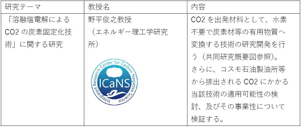 今回の包括連携協定書の締結を受け、コスモ石油と京都大学エネルギー理工学研究所附属カーボンネガティブ・エネルギー研究センター(2022年8月1日発足)は、特に、検討事項「(2)CO2の有価物への変換(CCU)」に関する検討領域において共同研究契約を締結(2023年3月20日)しました。本契約により、今後水素を使用することなくCO2を炭素材へ変換する技術の事業性検証を共同で進めてまいります。さらに、本共同研究において、コスモ石油の製油所等から排出されるCO2にかかる本技術の適用可能性についても検証いたします。