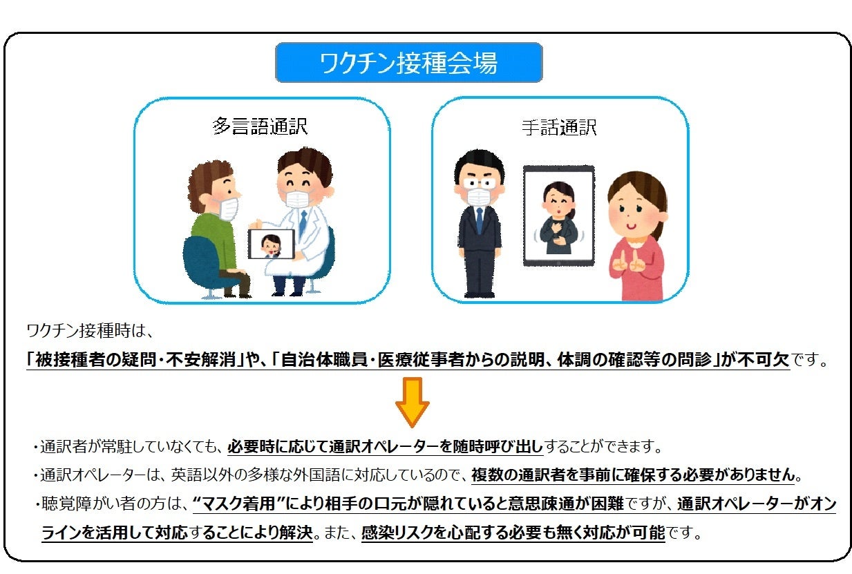 昨今の新型コロナウイスルワクチン接種に伴い、多言語通訳者や手話通訳者の確保が難しい地方自治体を中心としたワクチン接種会場へ導入される等、日本全国での活用が進んでおります。