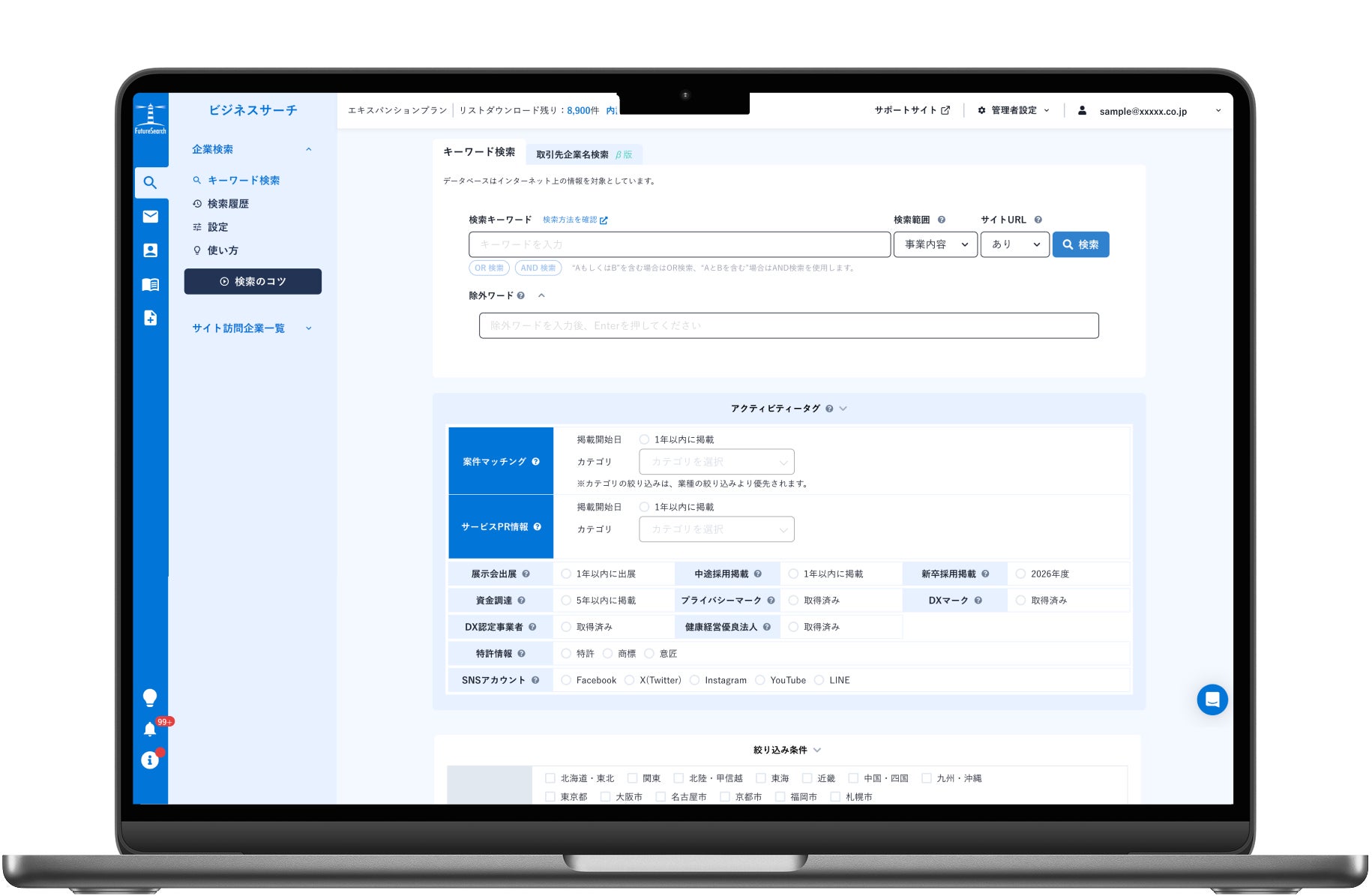 自社の強みを活かせる製造協力の可能性が高い中堅・大手の印刷会社へ的確にアプローチするため、精度の高いリスト抽出を実行しました。具体的には、検索キーワードに「印刷」を設定し、事業内容に「印刷」の文言を含む企業を幅広く抽出。そのうえで、ツールの「除外キーワード設定」を活用し、自社のターゲット層と合致しない「小ロット対応」などを掲げる企業をあらかじめリストから除外しました。さらに、抽出したリストを都道府県別に細かくセグメント分けすることで、各エリアに根ざした深掘りを行い、より確度の高いターゲット層へのアプローチを実現しました。