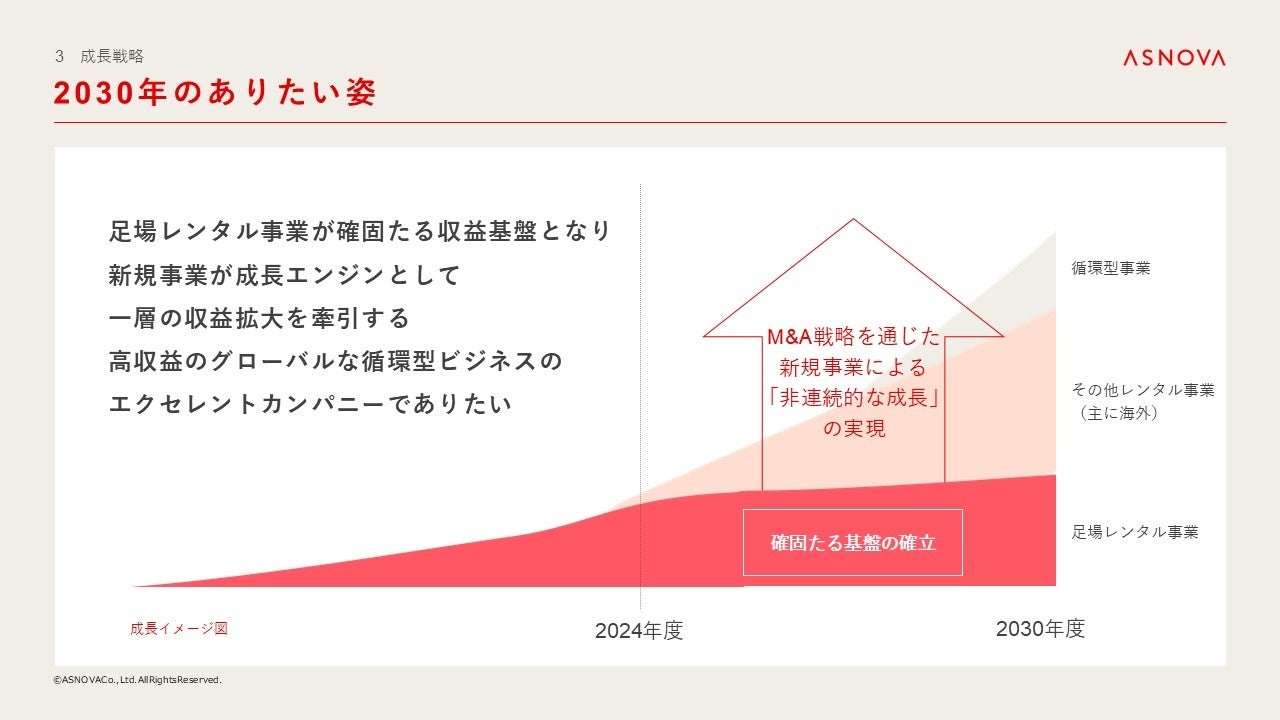 特にASEAN市場を主とした海外でのレンタル事業会社へのM&Aを加速し、2030年のありたい姿の実現を目指したいと考えております。一方で、進出しない領域も明確にし、M&Aに対するポリシーを大切にしながら、投資を実行してまいります。