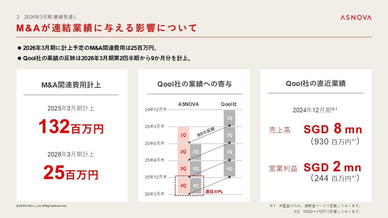 2026年3月期に計上予定のM&A関連費用は25百万円となります。そしてQool社の業績への寄与は、2026年3月期第2四半期からとなり、Qool社の4月から12月までの9か月分の業績が連結業績に寄与されてまいります。