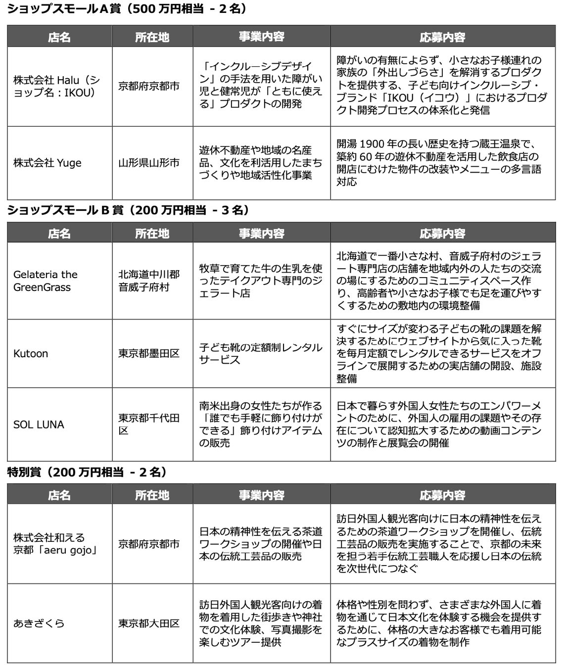 <受賞店舗および応募内容> ※店名50音順