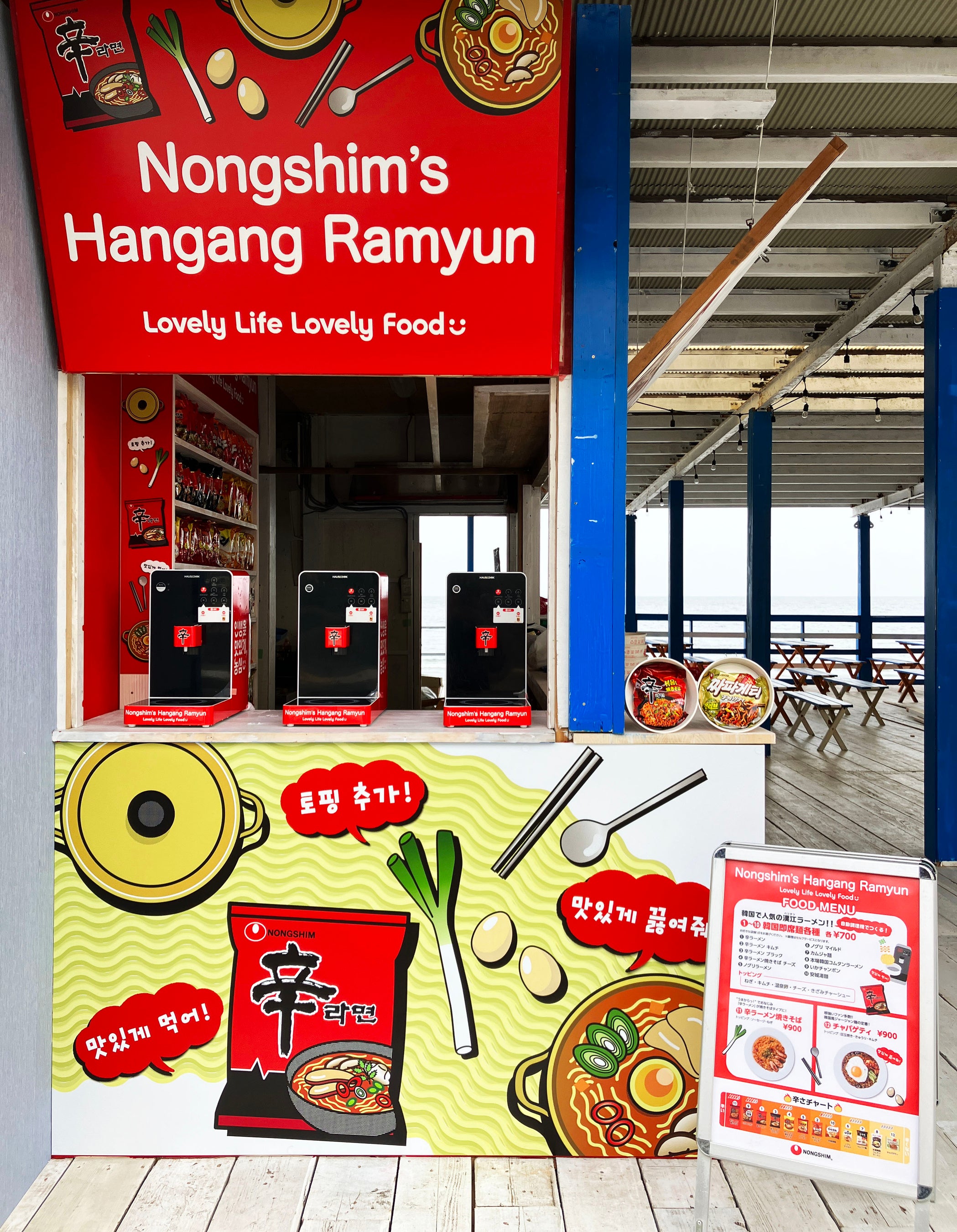 好評を受けて昨年に続く出店となる今年も、日本でも話題沸騰中の自動ラーメン調理機を導入。店舗名にもなってる本場韓国での楽しみ方「漢江ラーメン」をモチーフとし、王道の韓国ラーメン「辛ラーメン」をはじめとした豊富なラインナップの当社袋麺をビーチで楽しめる店舗として登場します。