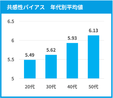 他者への共感・同情・感情移入のしやすさを表す「共感性バイアス」は、年代が上がるほど高くなり、50代の平均点は20代よりも0.64点高いという結果になりました。