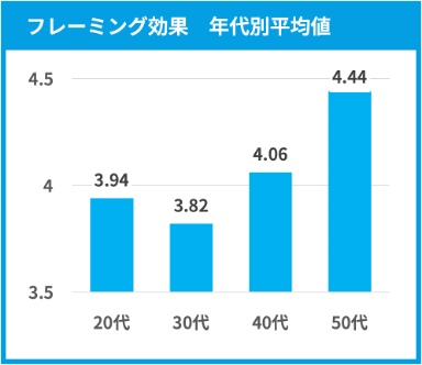 表現によって判断が変わりやすいかどうかを表す「フレーミング効果」は、年代が上がるほど強くなり、50代の平均点は20代よりも0.50点高い結果になりました。