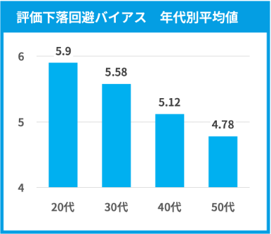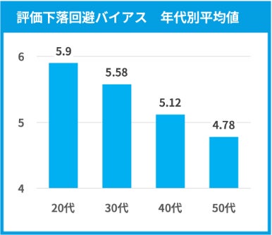 他者からの評価に対する感度「評価下落回避バイアス」は、年代が上がるほど弱くなり、20代の平均点は50代よりも1.12点高い結果になりました。