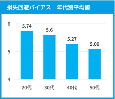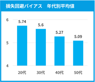 損失に対する感度「損失回避バイアス」は、年代が上がるほど弱くなり、20代の平均点は50代よりも0.65点高い結果になりました。